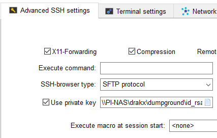 Once complete copy the id_rsa file to your ssh client, i use MobaXterm and here you place the link to the file in the advanced section also note the port in use is 8022;