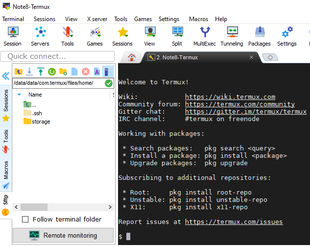 Now back in termux on your phone start the ssh server with sshd then launch MobaXterm or other & client enter the passphrase (if you set one up) and a user name (any will do) and you should see a screen such as;